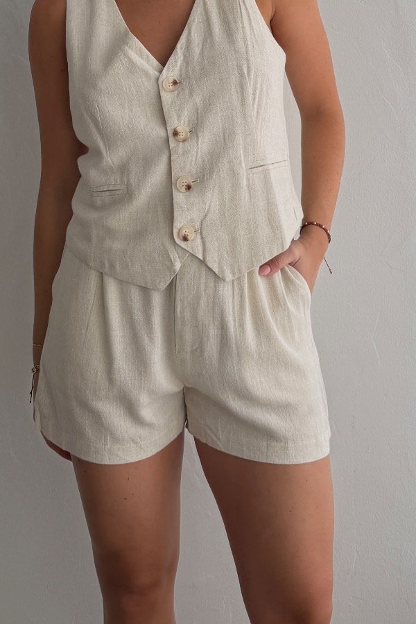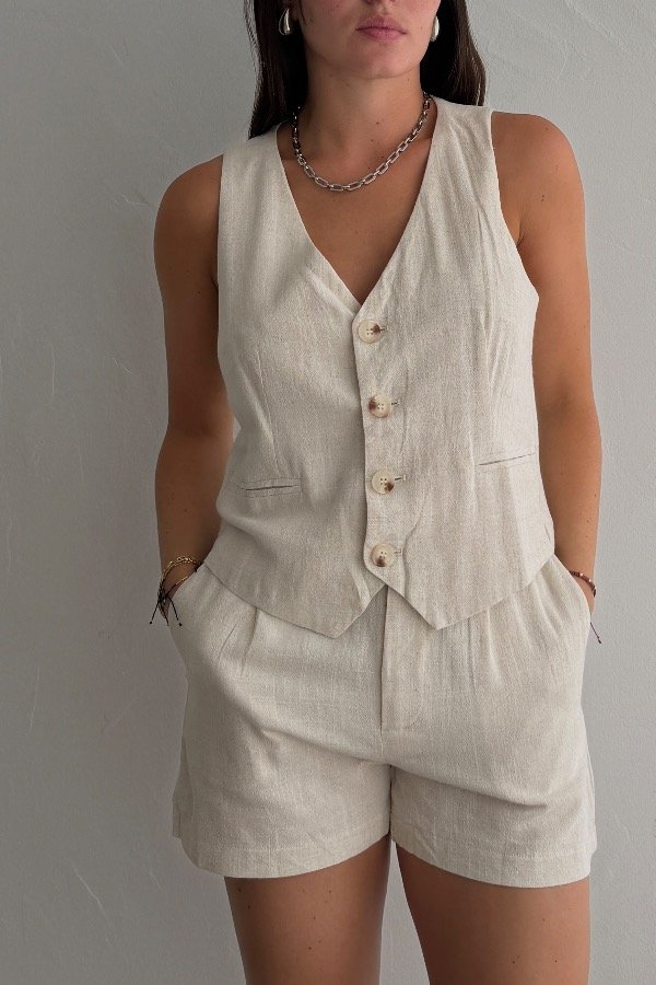 Descripción: short importado confeccionado en lino sastrero. Podes combinarlo con el chaleco. Referencia: en la foto usa talle S.