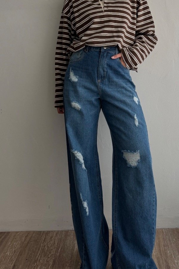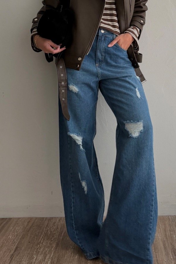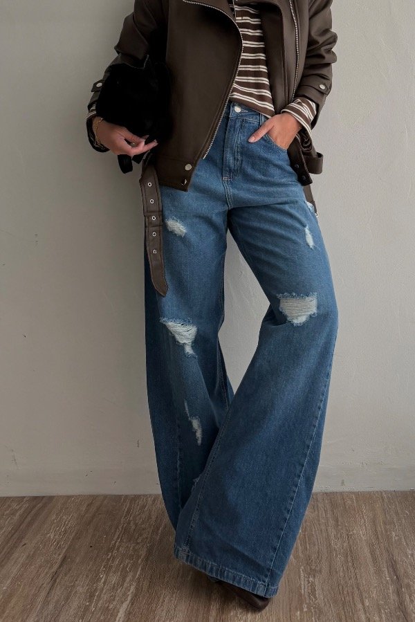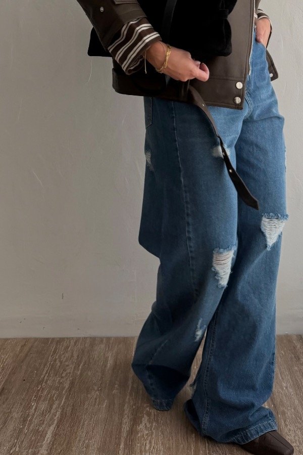 Descripción: jean corte baggy, tiro alto con detalle de roturas en el frente. Color azul clásico. Hilo en color maíz y avios color niquel. Denim rigido, cede con el lavado.