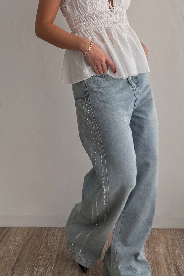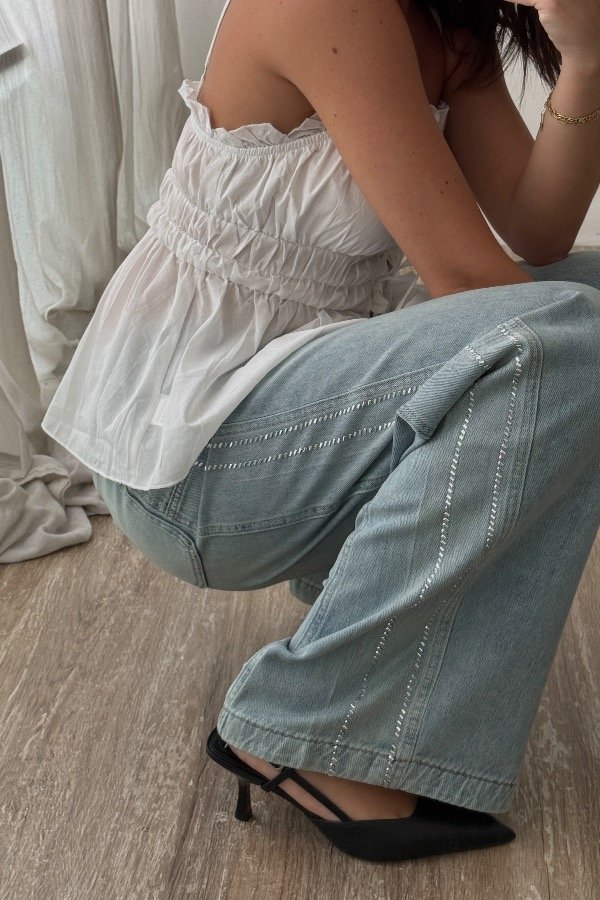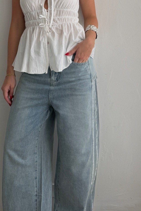 Descripción. pantalón wide leg importado, con detalle de strass en los laterales. Estilo tiro caído. Lona elastizada y super liviana.