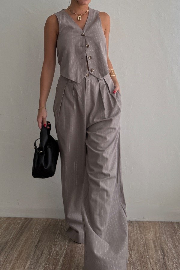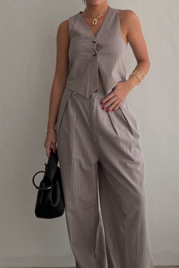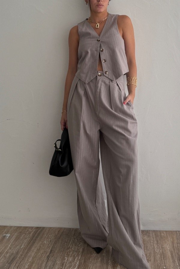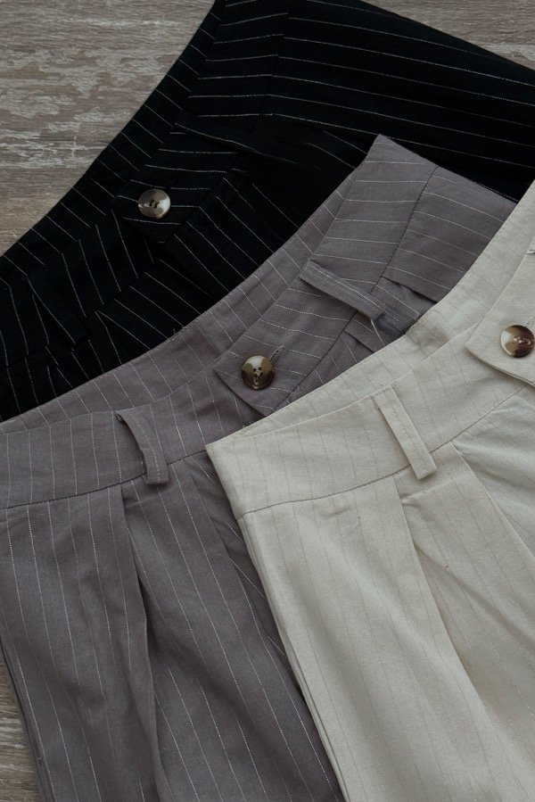 Descripción: pantalón sastrero pinzado, confeccionado en lino sastrero. Detalle de rayas con lurex. Tiro caído, con detalle de botón en carey. Super canchero. Podes usarlo en set con el Chaleco Poire.