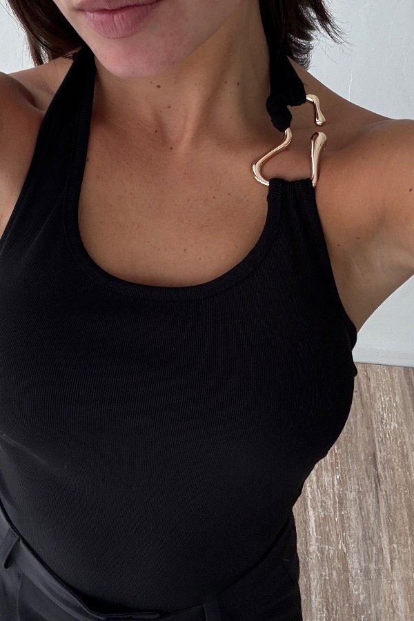 Descripción: musculosa top, cuello halter con detalle en el cuello. Confeccionada en morley microfibra. Tiene spandex, lo que te da un calce espectacular.