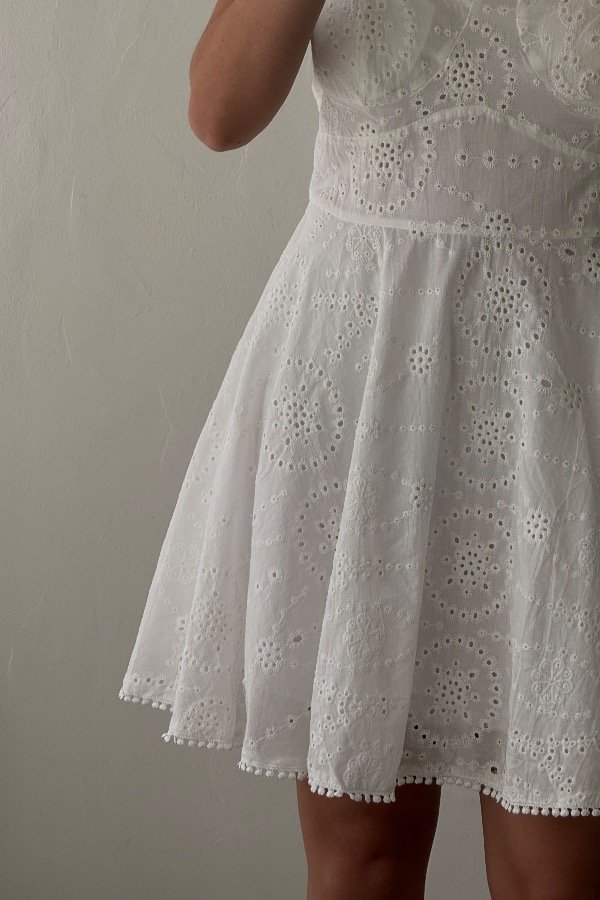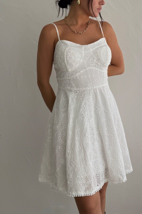 Descripción: vestido de broderi, con detalle de tazas. Tiras regulables. Tiene forreria interna. Confección amplia.