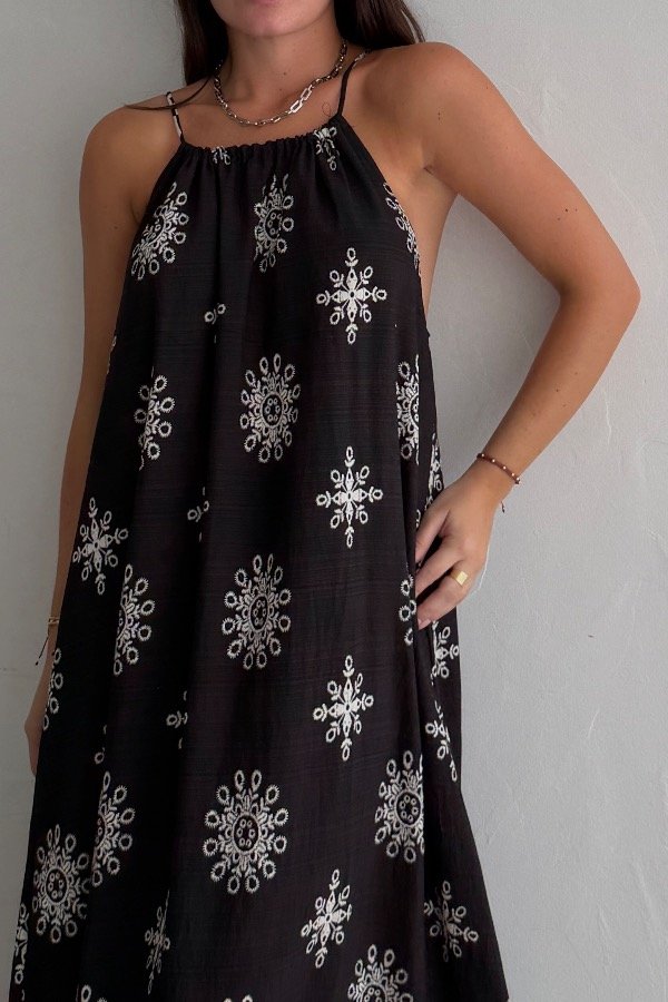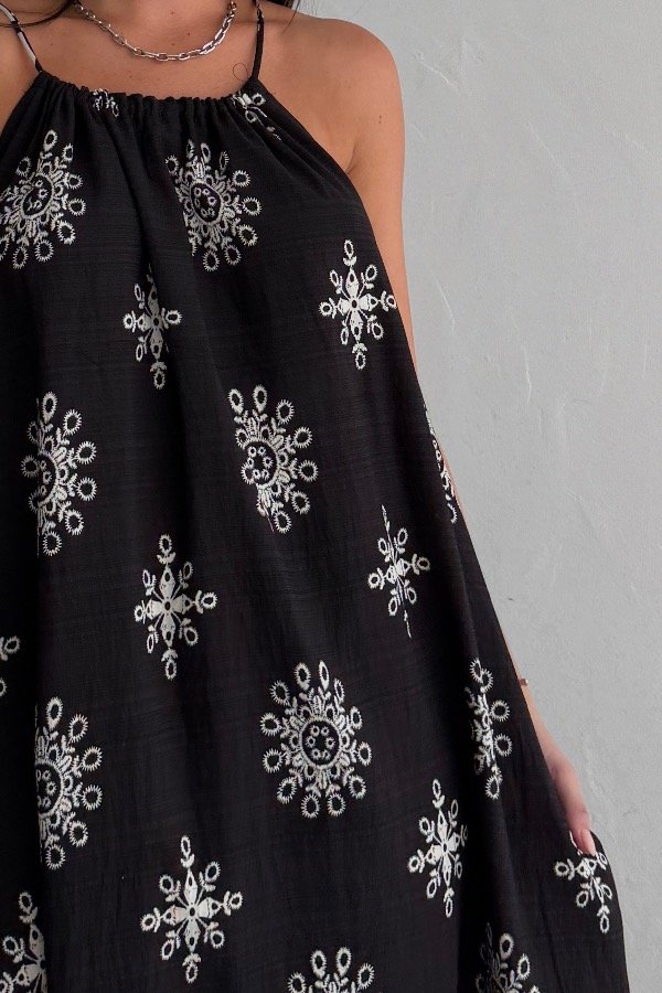 Descripción: vestido confeccionado en lino con detalle de bordado. Bolsillos laterales.