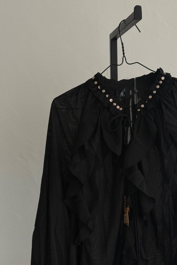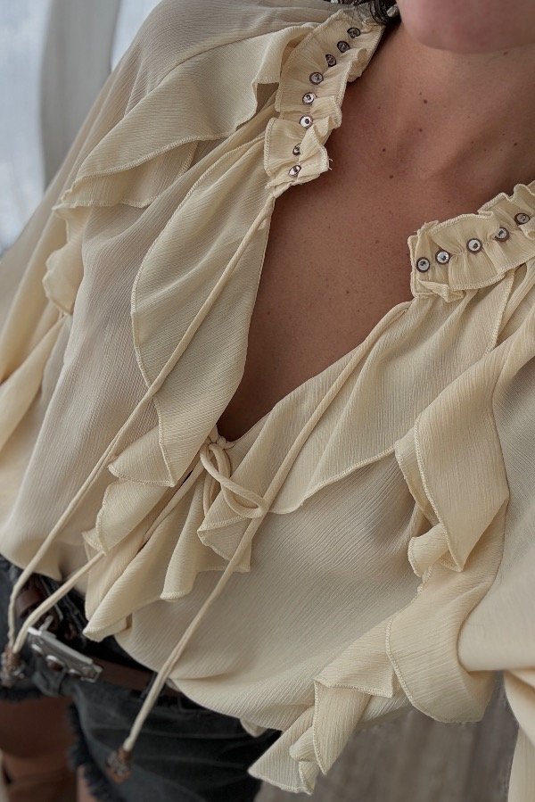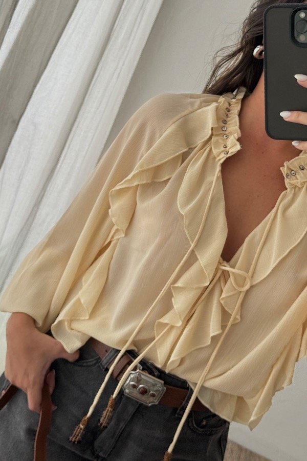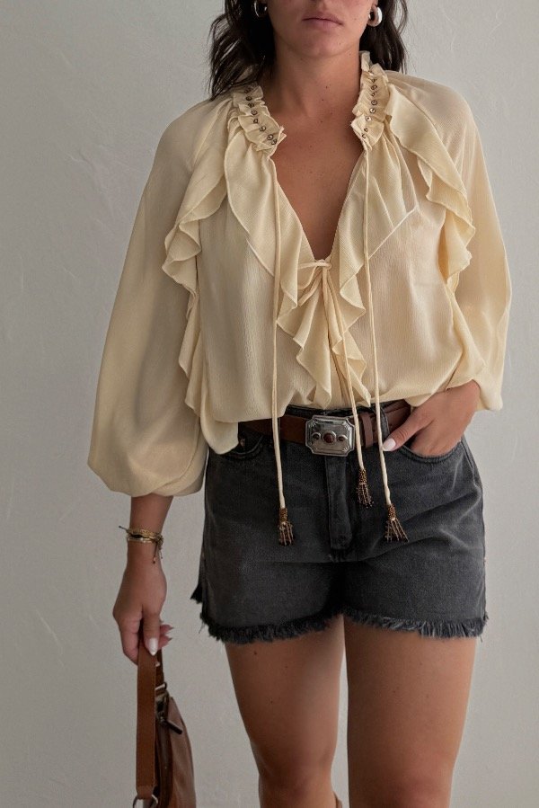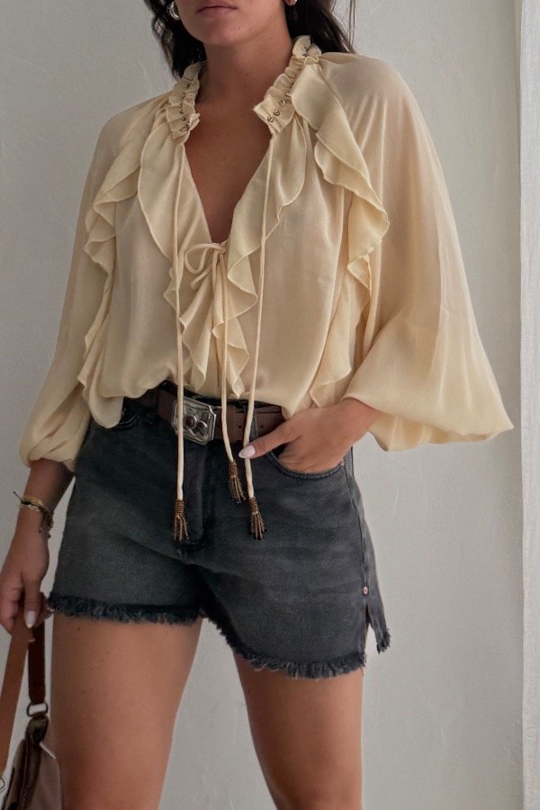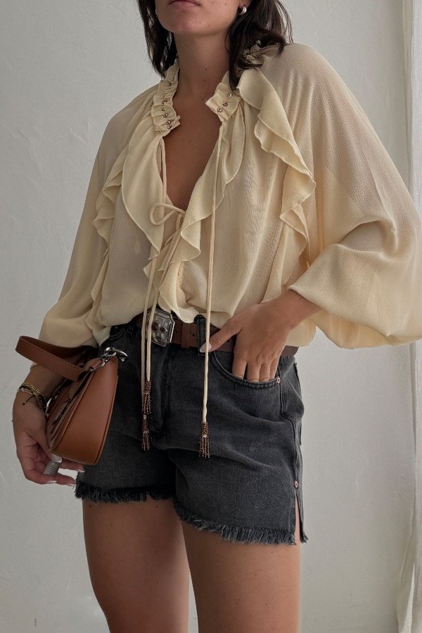 Descripcion: camisa de gasa con volados. Detalle de bordado en el cuello. Frente para atar. Tiene una leve transparencias. Disponible en vainilla y negro.