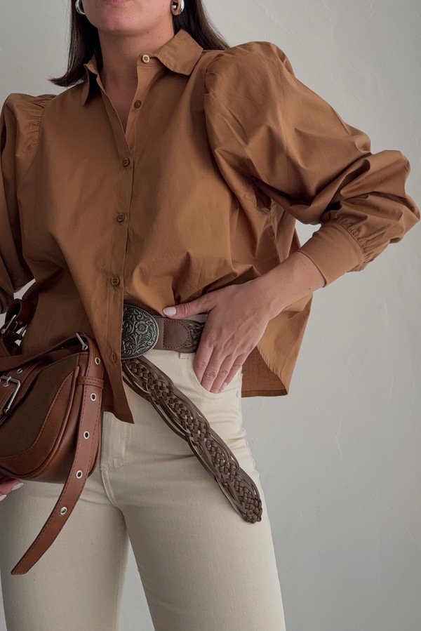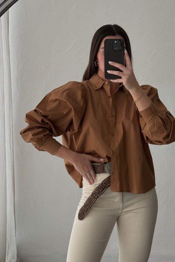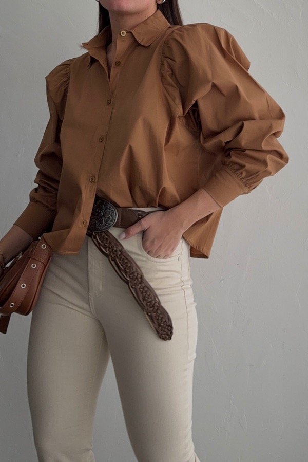 Camisa confeccionada en poplin con lycra. Detalle de pinzas en los hombros, que da un efecto de globo. Largo a la cadera. Disponible solo en blanco.