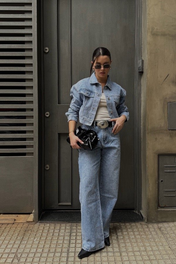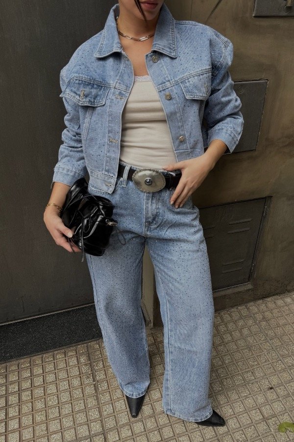 Descripción: campera de jean con detalle de hotfix. Recomendamos tener cuidado al lavar la prenda, evitar el rose. No usar lavarropas.