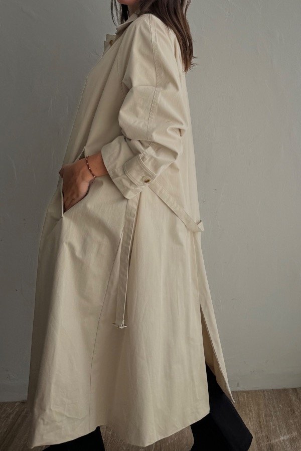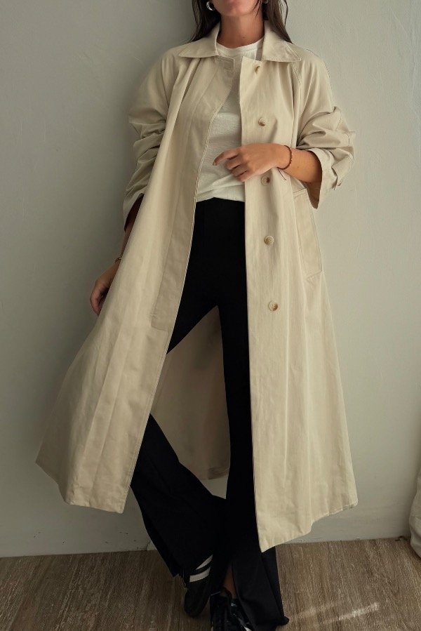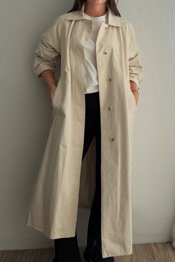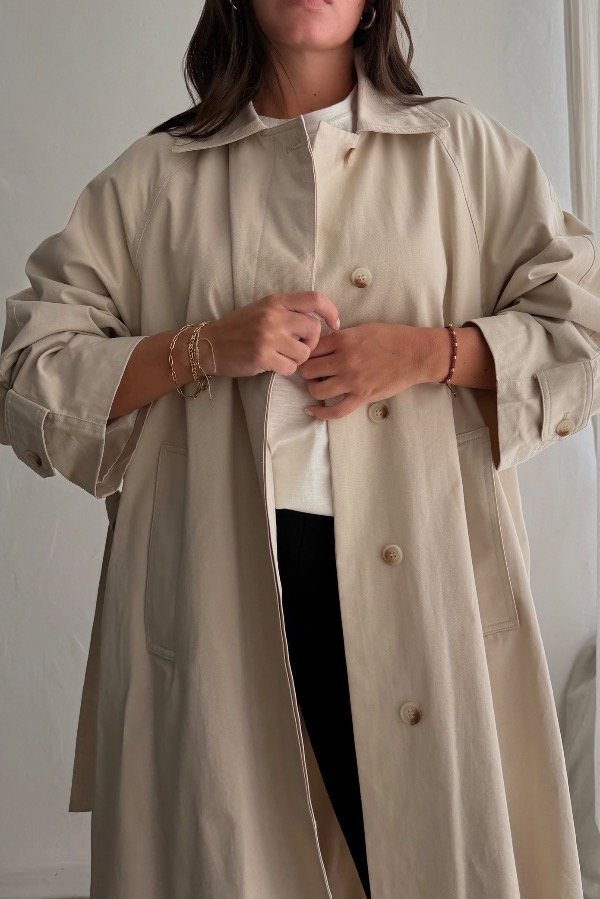 Descripción: trench importado, confeccionado en gabardina de algodón. Disponible en beige y gris plomo. Botones en carey, bolsillos laterales super amplios. Talle único.