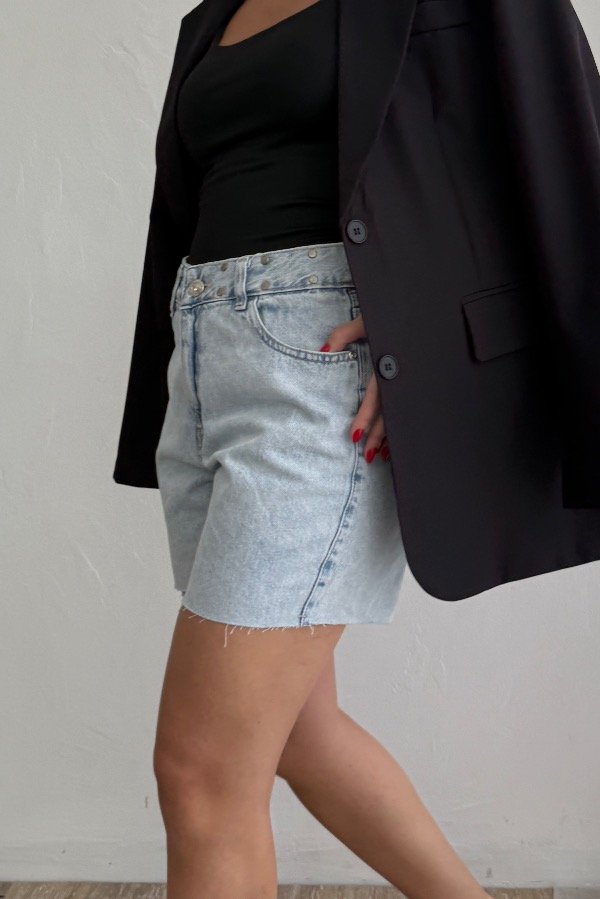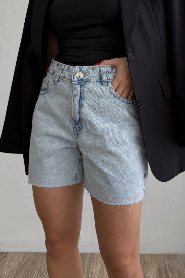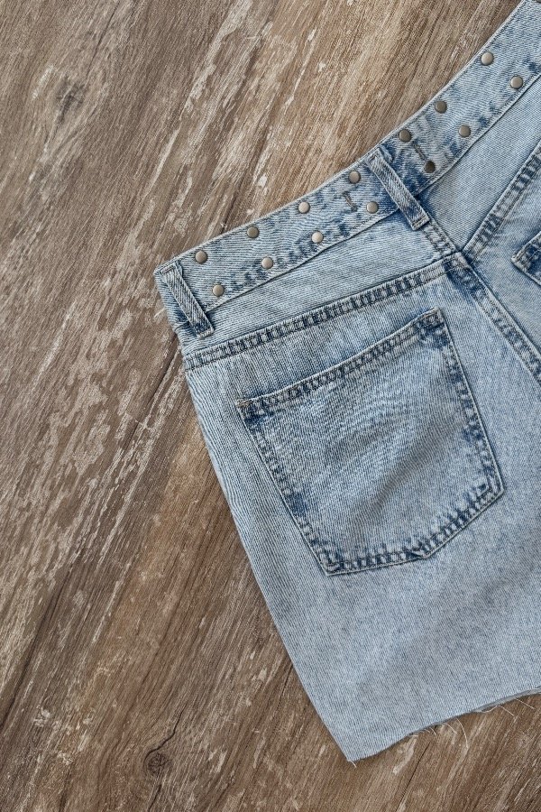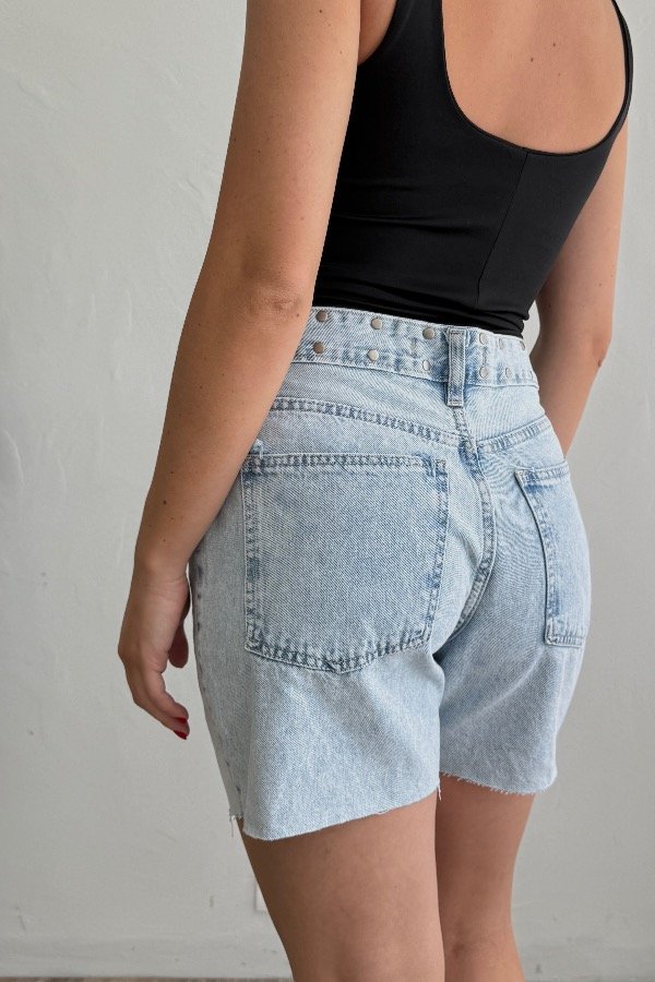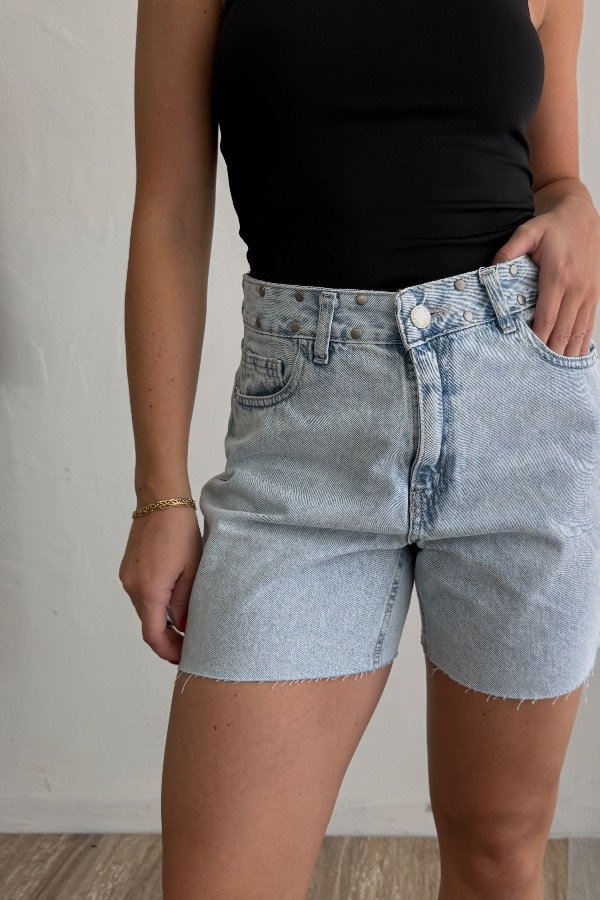 Descripción: short bermuda con detalle de tachas en la cintura. Confeccionada en denim rígido, cede con el lavado.