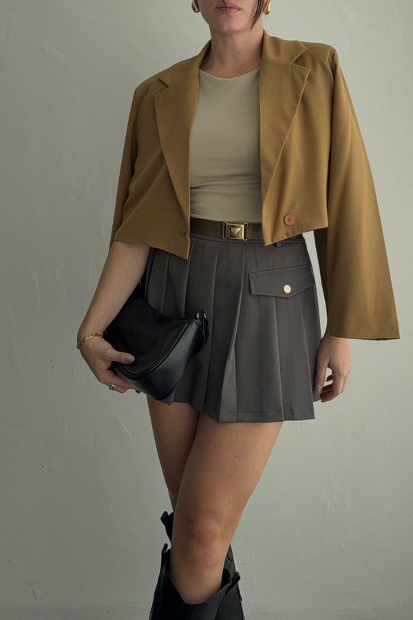 Pollera a tablas, confeccionada en tela sastrera. Detalle de falso bolsillo. Incluye el cinto, es desmontable.