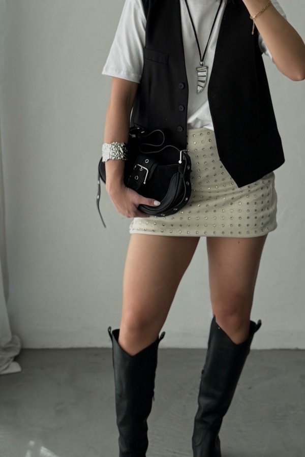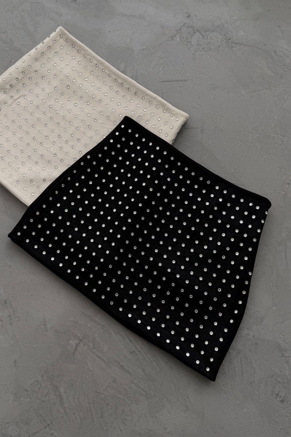 Pollera confeccionada en gamuza, con detalle de remache de strass. Forro interno al tono y cierre lateral invisible. Confección tirando a pequeña.
