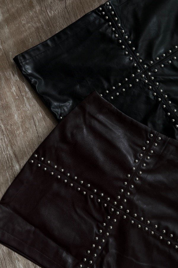 Descripción: pollera de eco cuero importada, con tachas. Cierre lateral invisible. Disponible en color negro y chocolate.