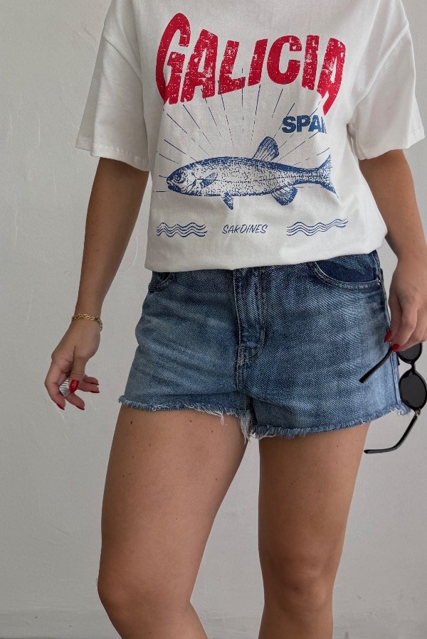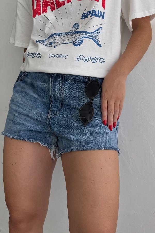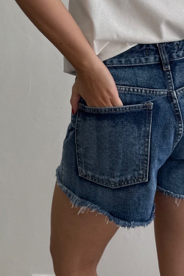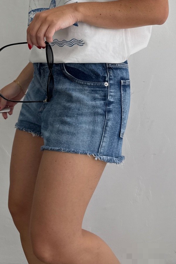 Descripción: short de jean tiro medio bajo. Azul localizado, con terminaciones desflecadas. Referencia: En la foto usa talle 38.
