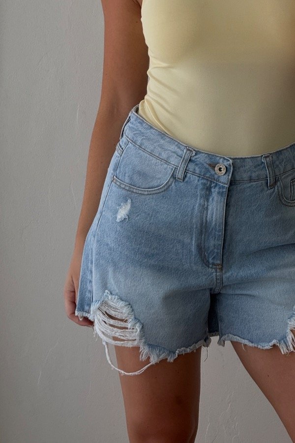 Descripción: short de Jean con detalle de roturas en el frente. Denim rígido, cede con el lavado.