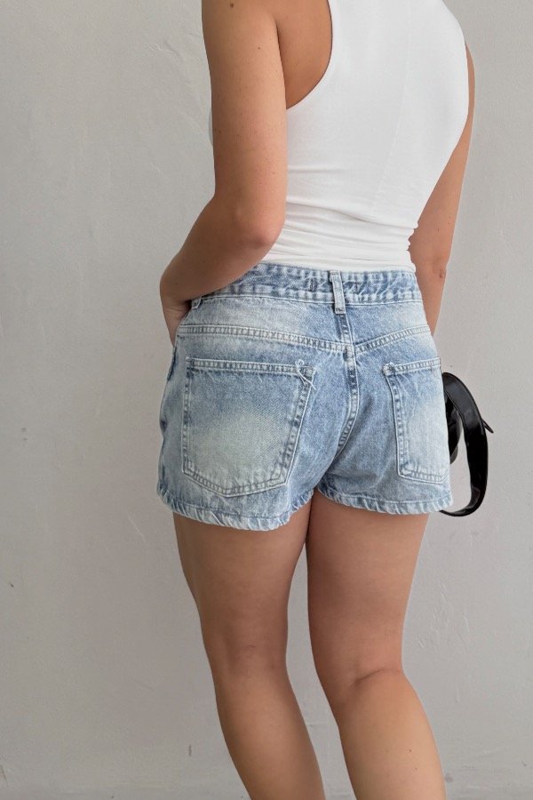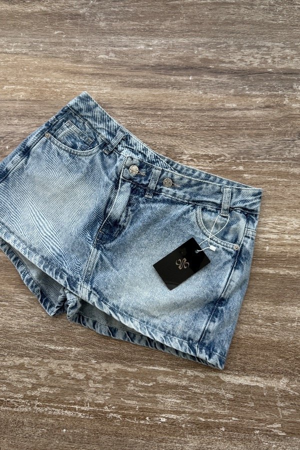 Descripción: short pollera de jean, con detalle de botones cruzado. Tiro medio. Confeccionado en denim rígido, cede con el lavado.