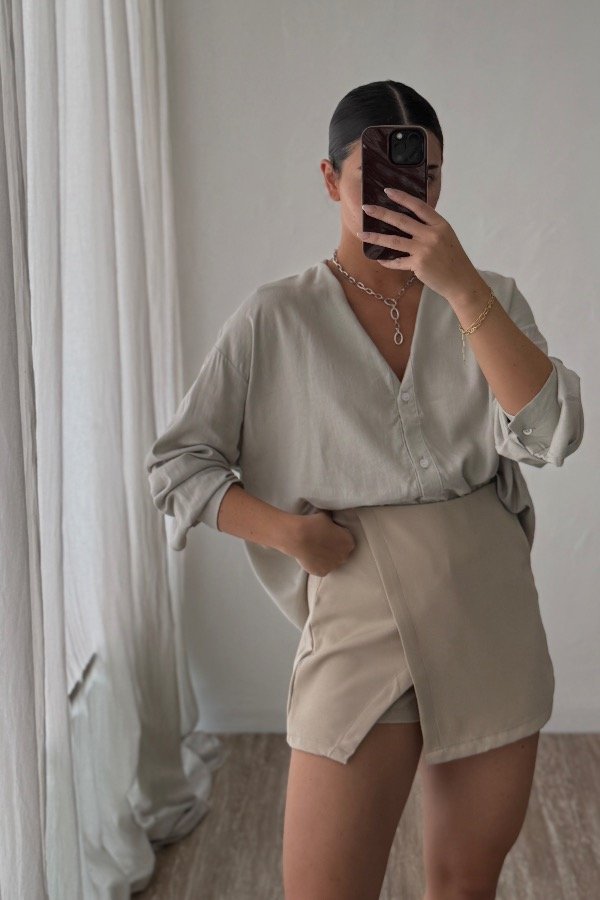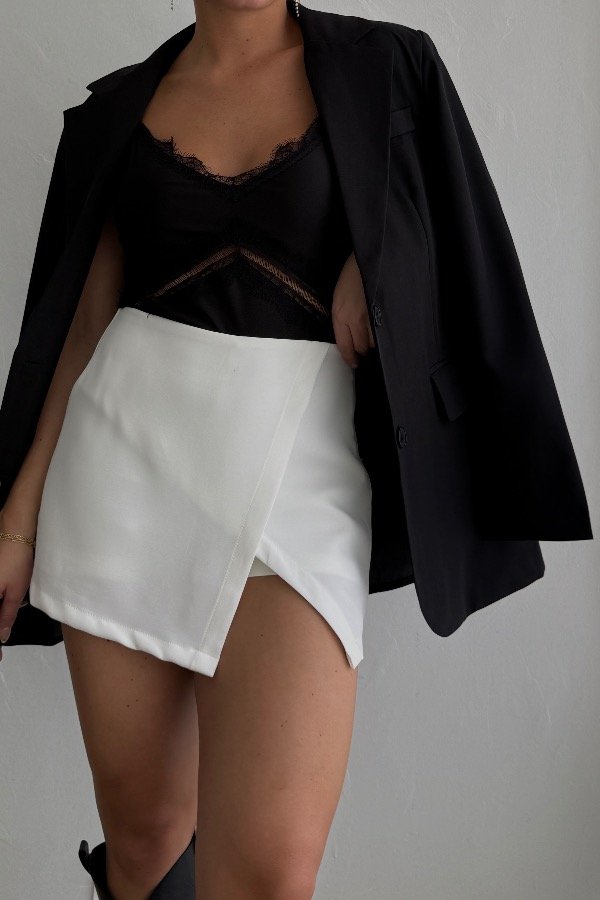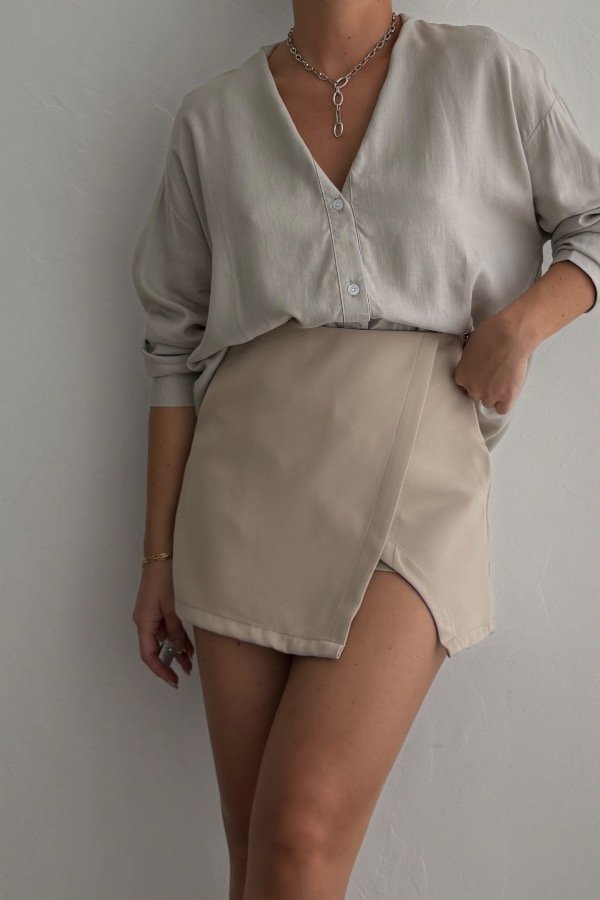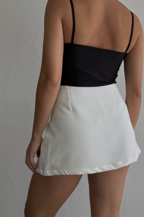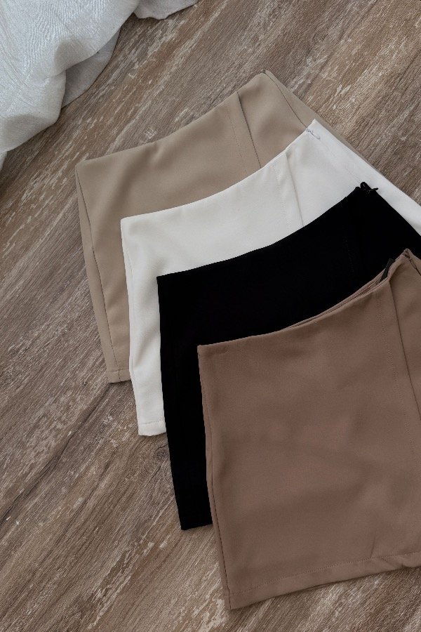 Short-pollera, con solapa en el frente. Cierre lateral invisible. Por atrás es pollera. Disponible solo en color negro y visón.