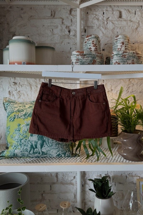 Descripción: short pollera de jean en color chocolate. Tiro medio.