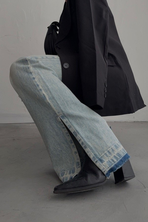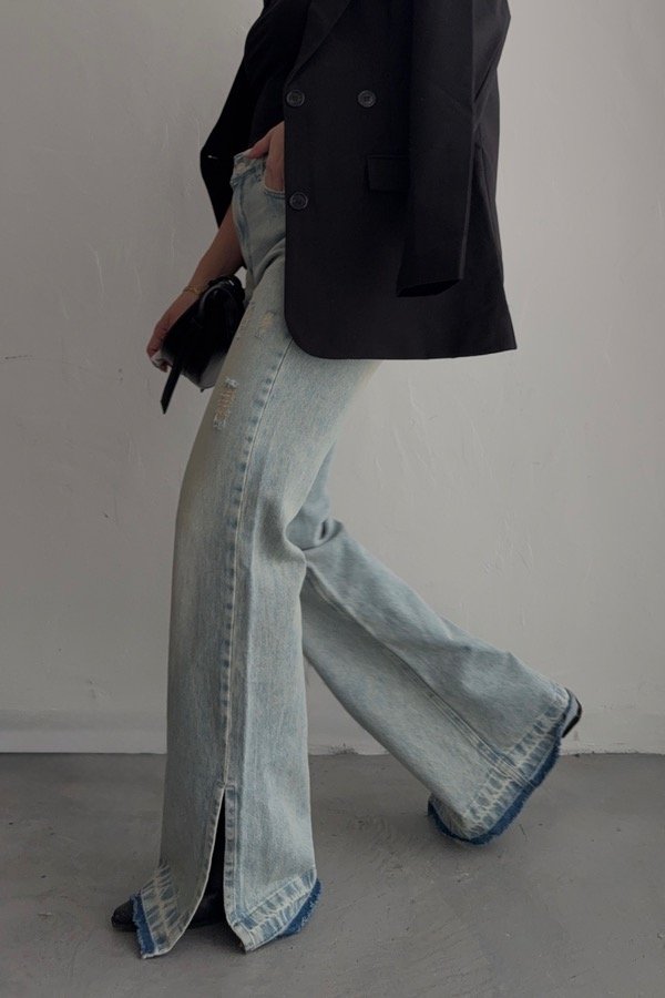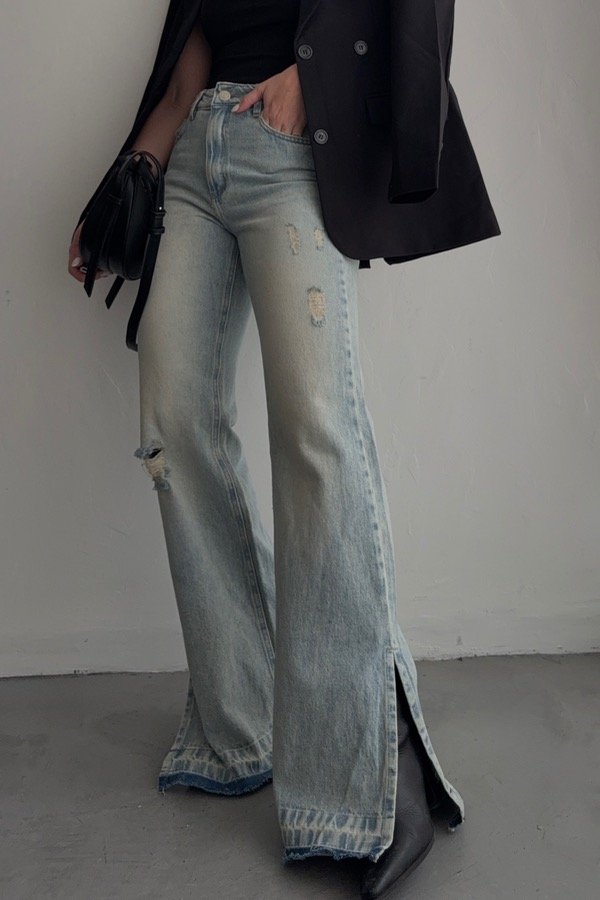 Jean estilo semi oxford, con detalle de tajo en la parte inferior. Detalle de roturas. Denim rigido, cede con el lavado.