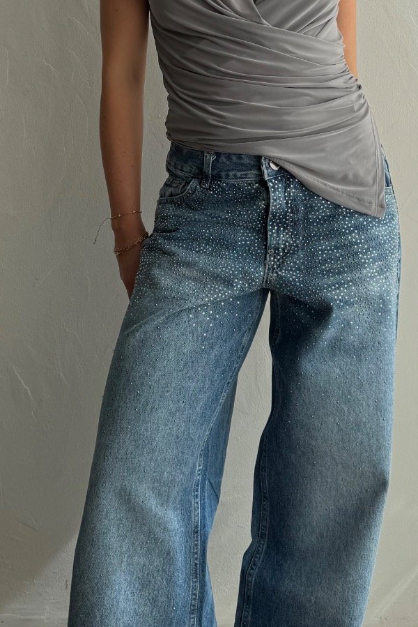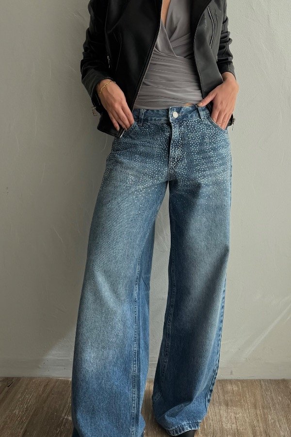 Descripción: jean wide leg con detalle de hotfix en el frente. Confeccionado en denim rígido. Recomendamos lavado a mano para preservar el estado de la prenda.