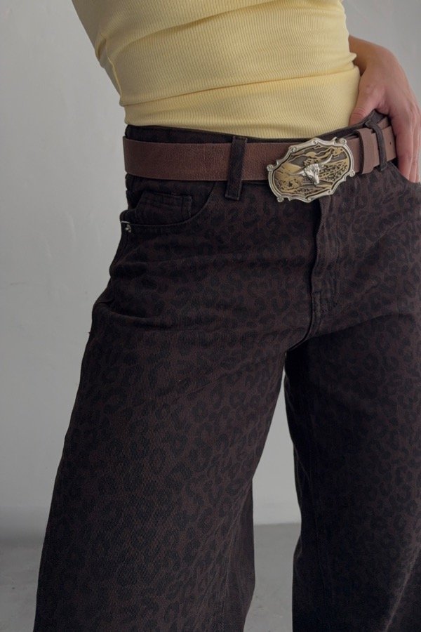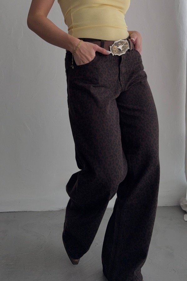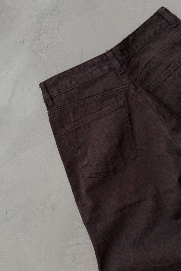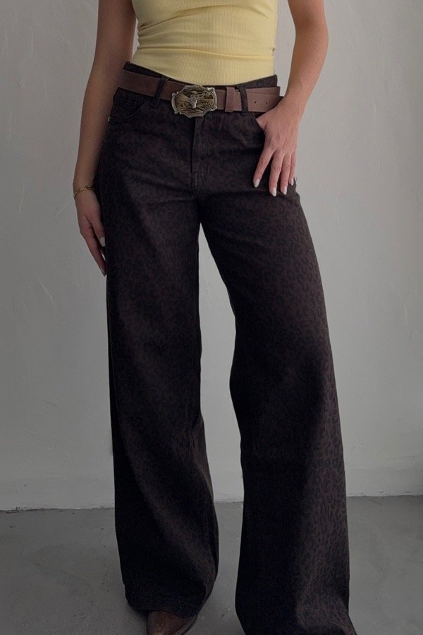 Wide leg de denim rígido estampado. Confección grande.