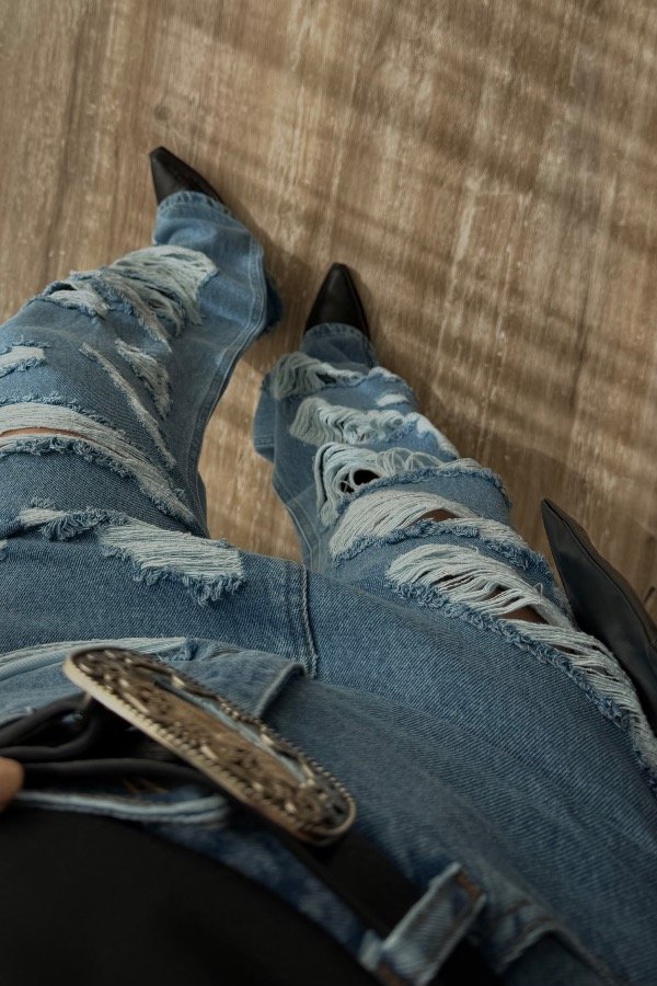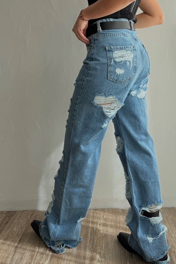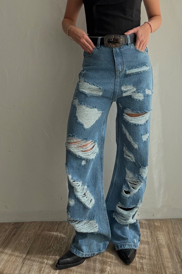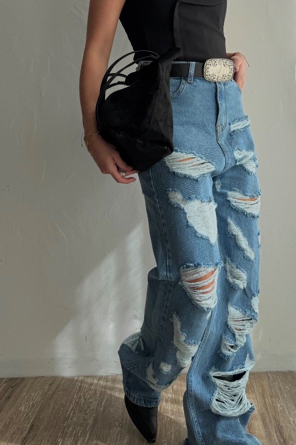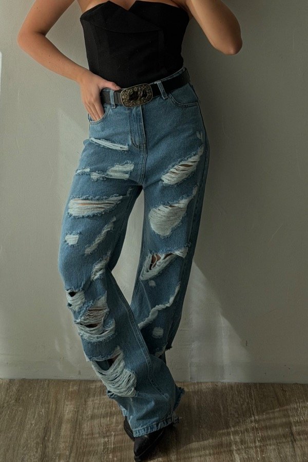 Descripción; jean straight con detalle de roturas. Color celeste clásico. Tiro alto. Denim rígido, cede con el lavado.