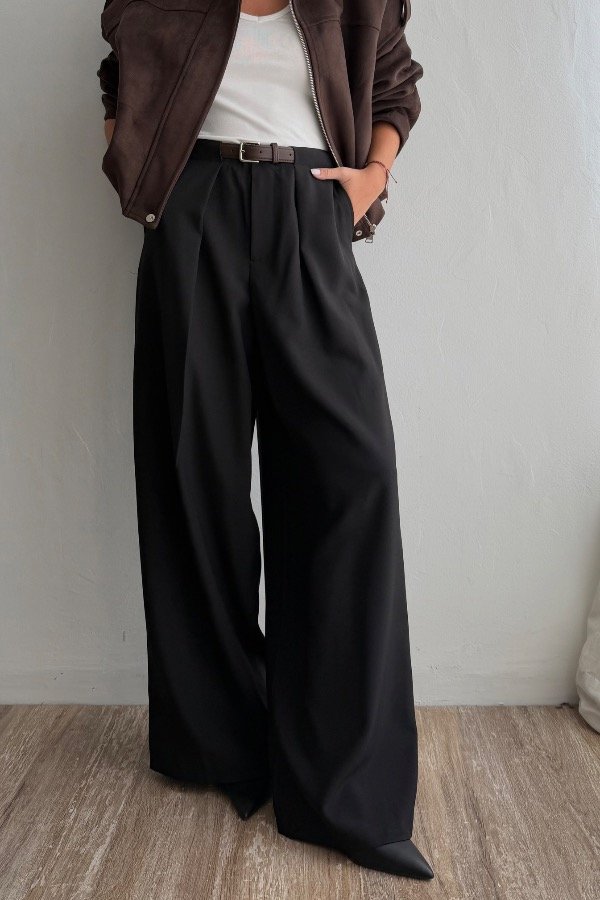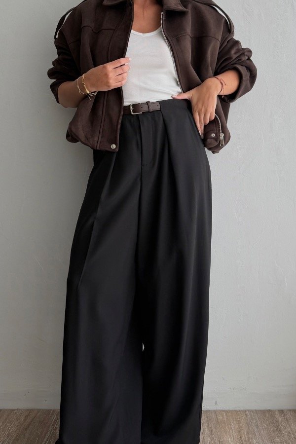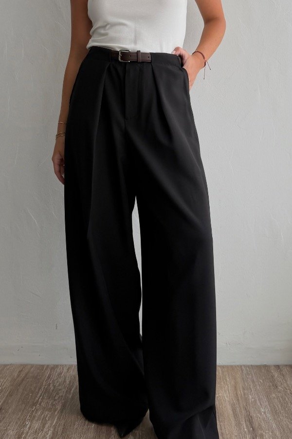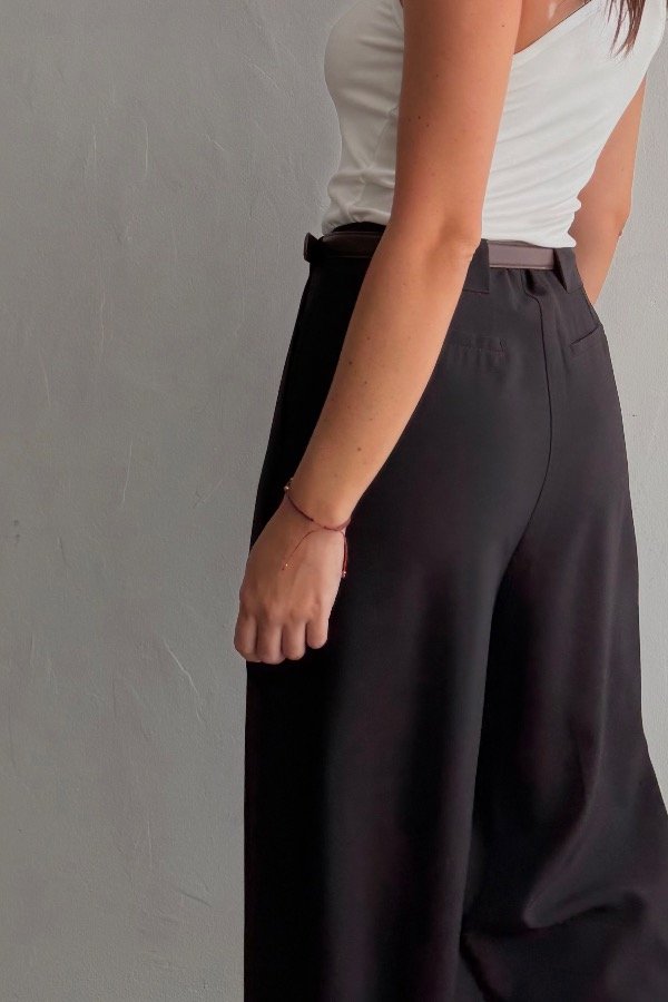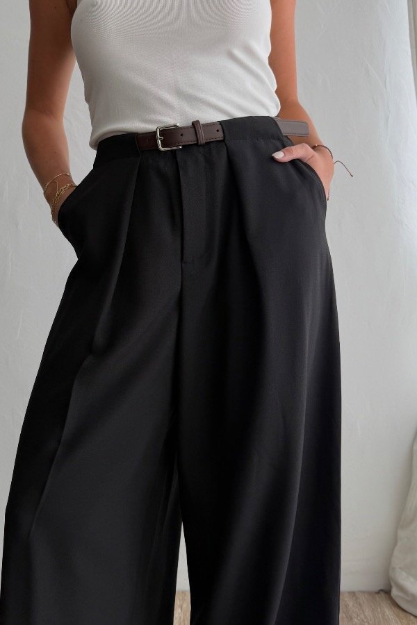 Descripción: Pantalo sastrero premium tiro alto. Cintura con trabillas y detalle de pinzas. Botón y cierre delanteros. Pierna ancha. Bolsillos laterales reales y chinos traseros. Incluye cinturon de ecocuero.