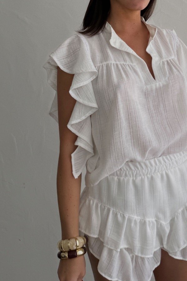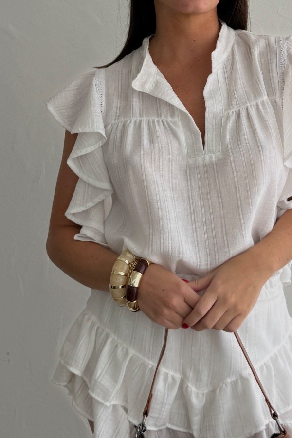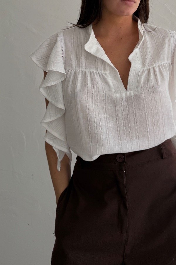 Descripción: blusa confeccionada en lino ratier. Cuello mao, con detalle de volados en el lateral. Podes combinarla con la Falda Nara.