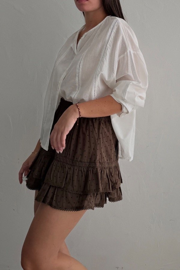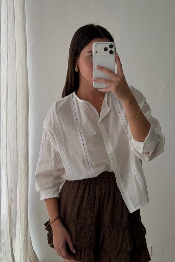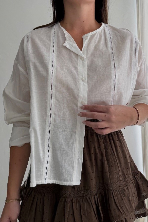 Descripción: camisa cuello Mao, confeccionada en poplin, con detalle de puntilla. Estilo oversize. Referencia: en la foto usa talle S.