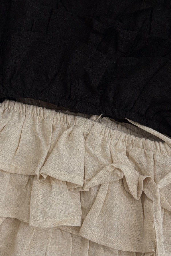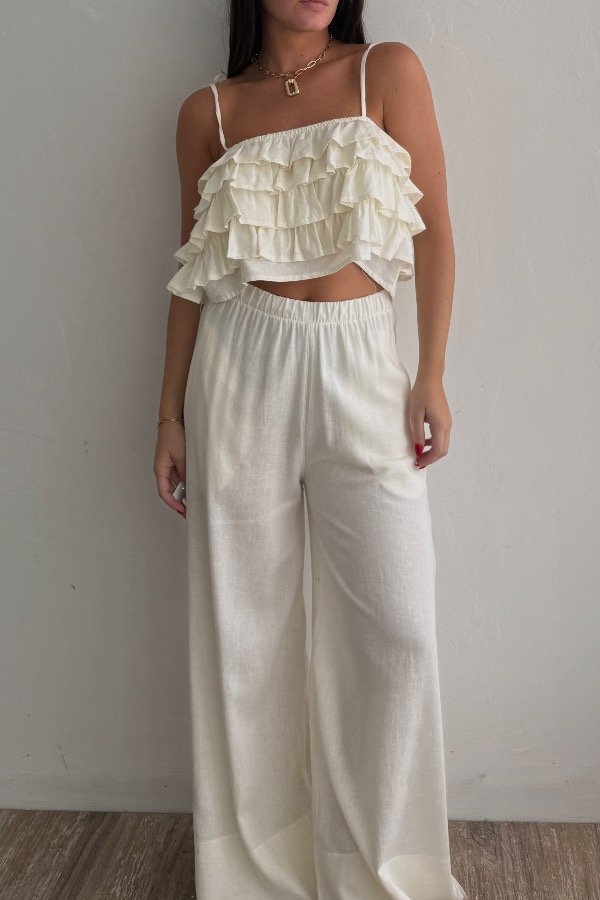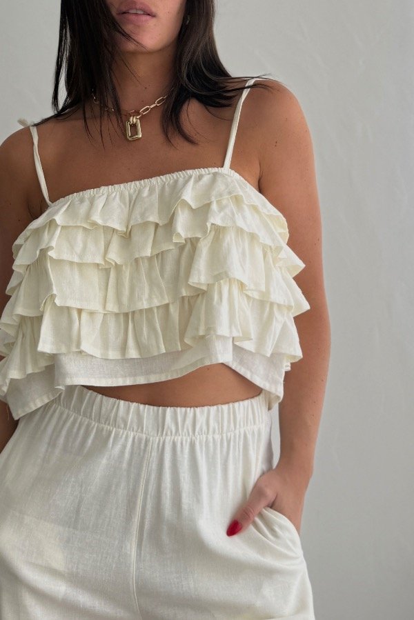 Descripción: top confeccionado en lino, con detalle de volados. Breteles regulables.