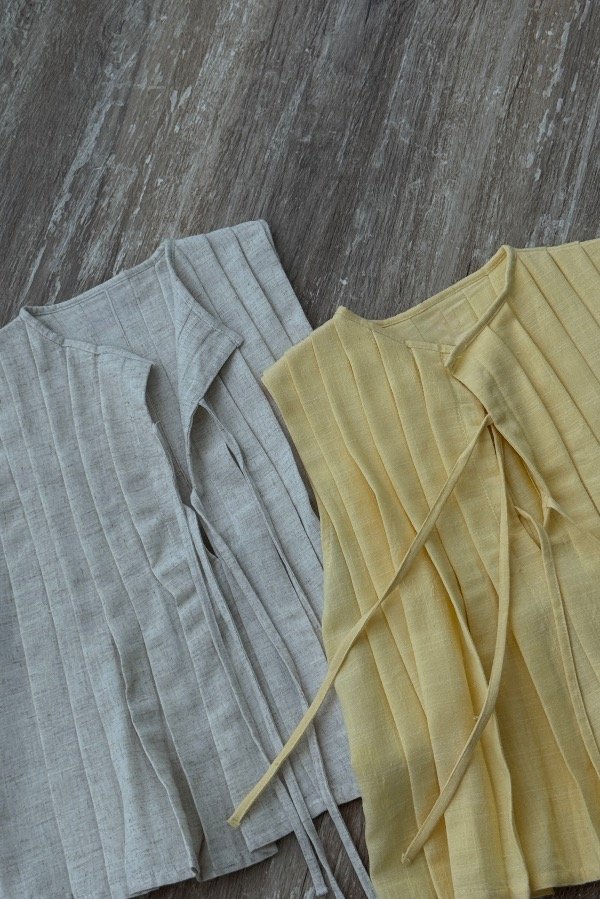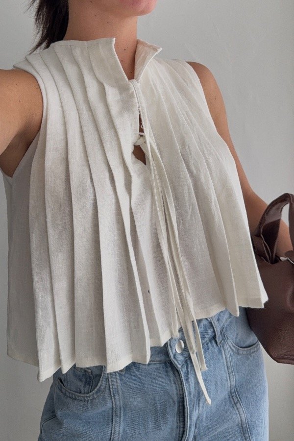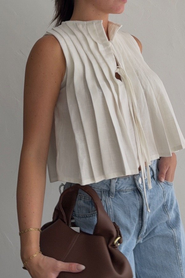 Descripción: blusa confeccionada en lino, con detalle de alforzas y tiras para atar en el frente. Disponible en beige, blanco y amarillo.