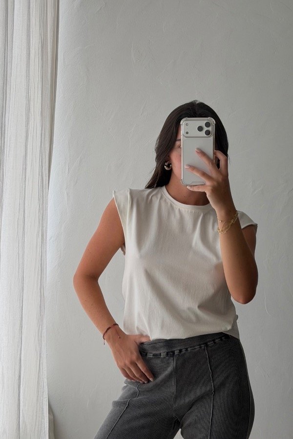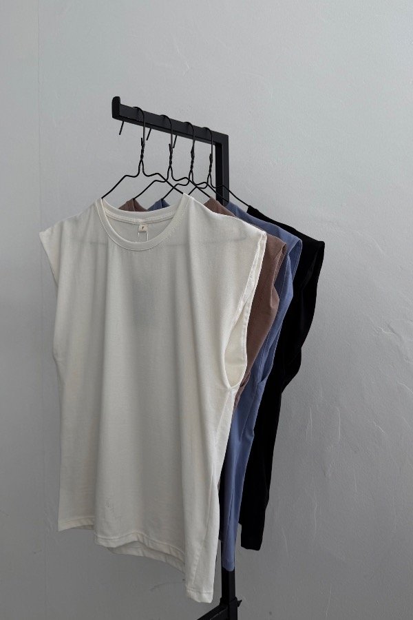 Descripción: remera musculosa, confeccionada en algodon premium. Tiene falsas hombreras. DIsponible en 4 colores: blanco, celeste, vison y negro; y en 4 talles.