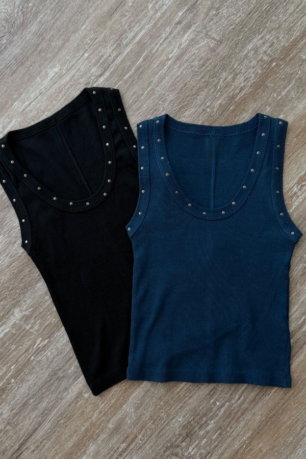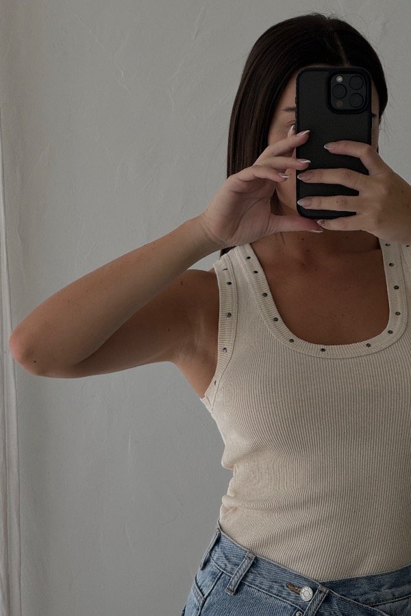 Descripción: musculosa cuello redondo confeccionada en morley con detalle de tachas en el cuello. Disponible en 3 colores.