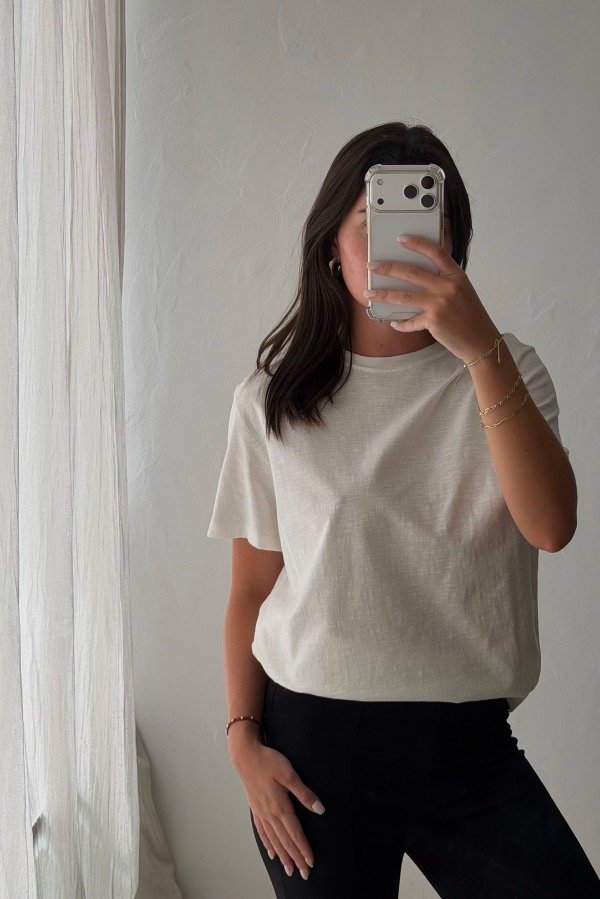Descripción: remera confeccionada en flame de agodón, talle único. DIsponible en 3 colores: blanco, beige y negro.