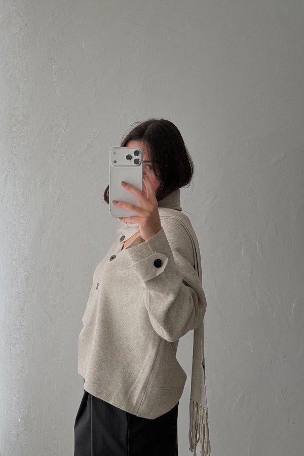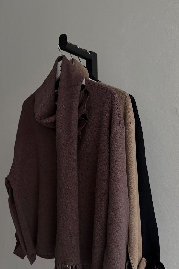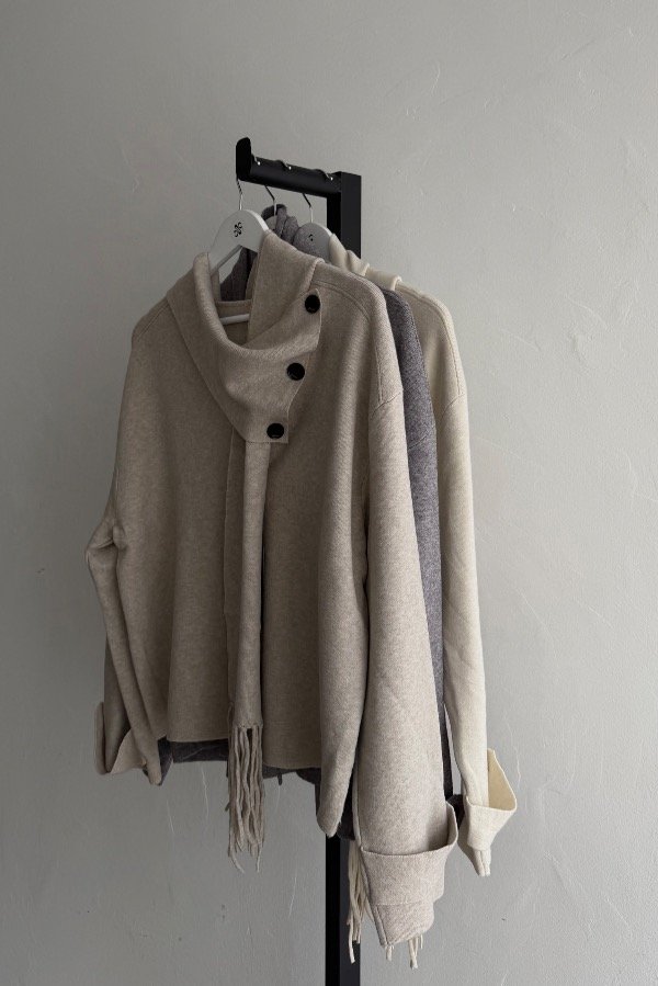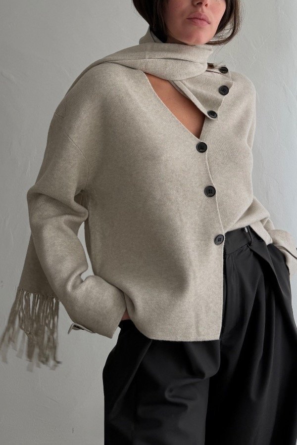 Descripción: sweater estilo cárdigan importado confeccionado en hilado bremer pesado. Detalle de botones al contratono. Incluye el accesorio de bufanda para atar al mismo.