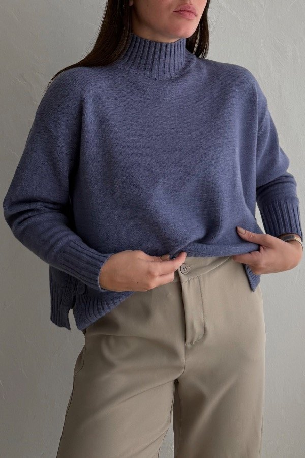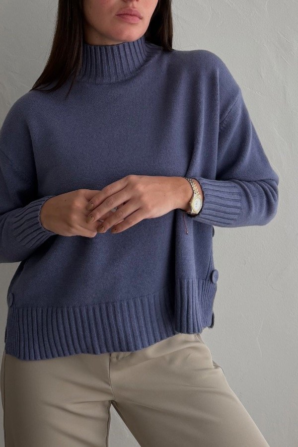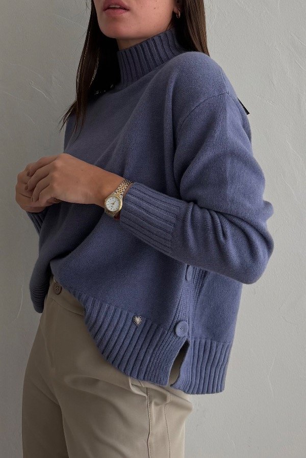 Descripción: sweater cuello alto, confeccionado en hilado bremer pesado. Detalle de botones al tono en los laterales. Calidad única.