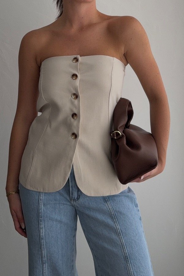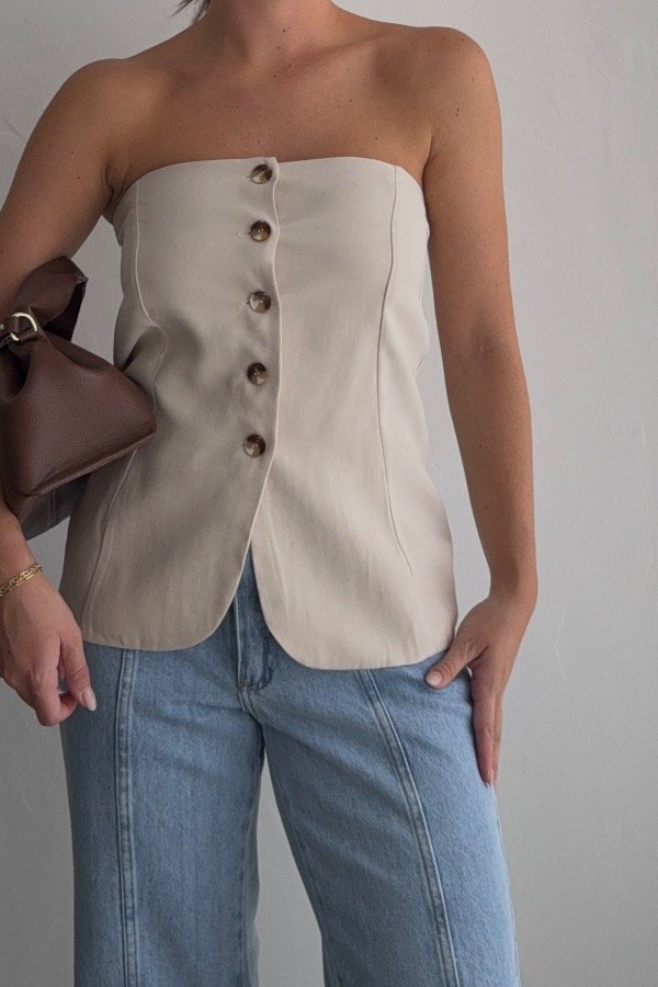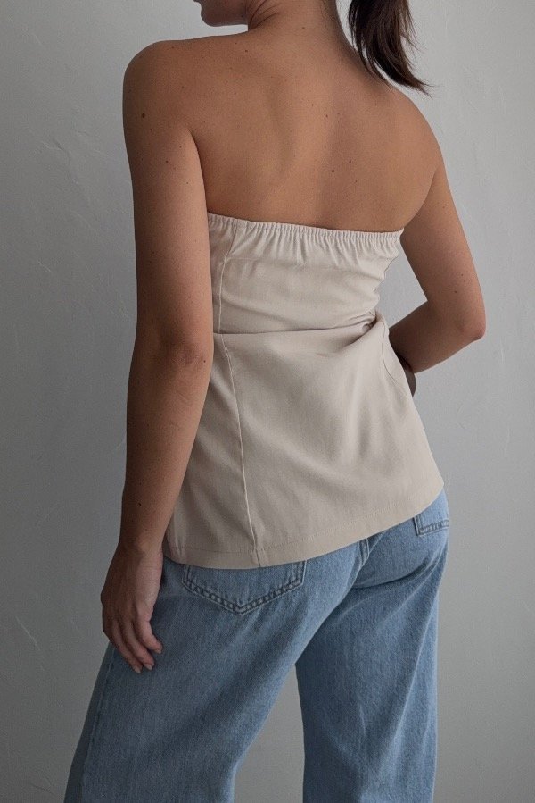 Descripción: strapples confeccionado en tencel sastrero. Detalle de botones en carey. Disponible del S al L, en 4 colores.
