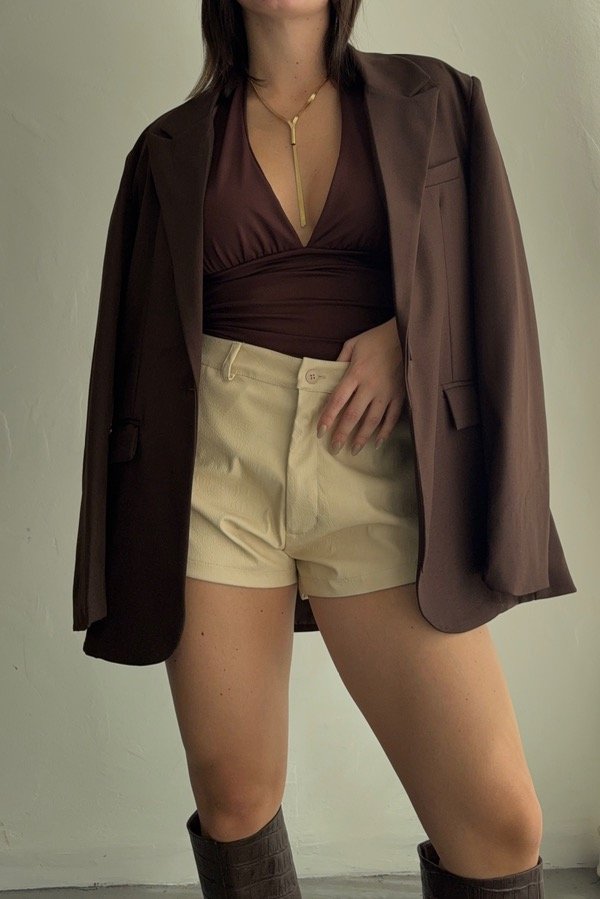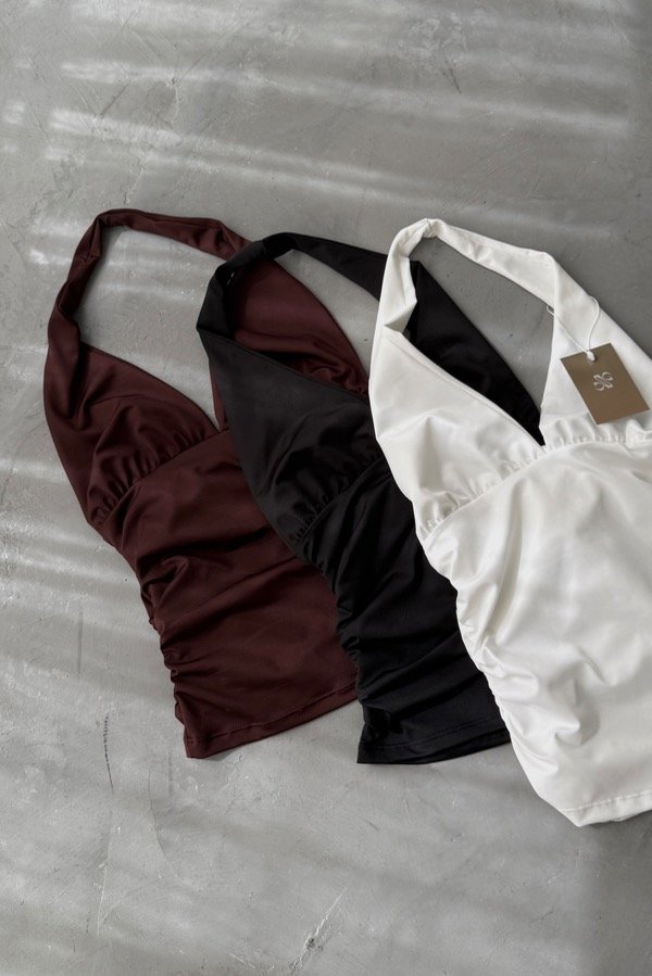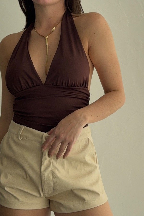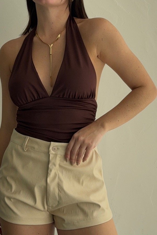 Top escote en V, con frunces laterales. Confeccionado en lycra pesada, doble tela.