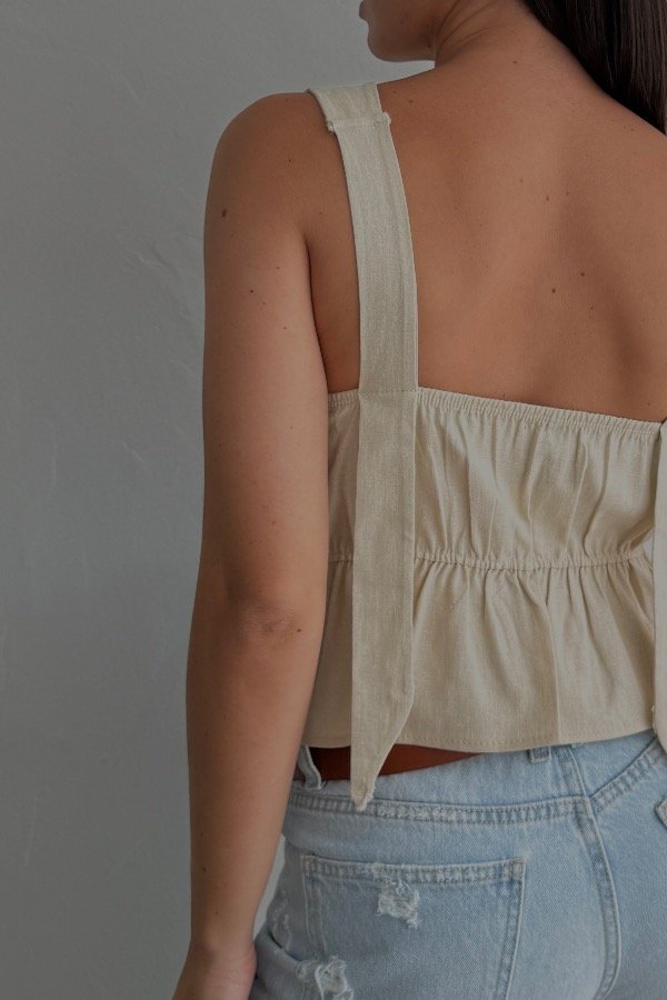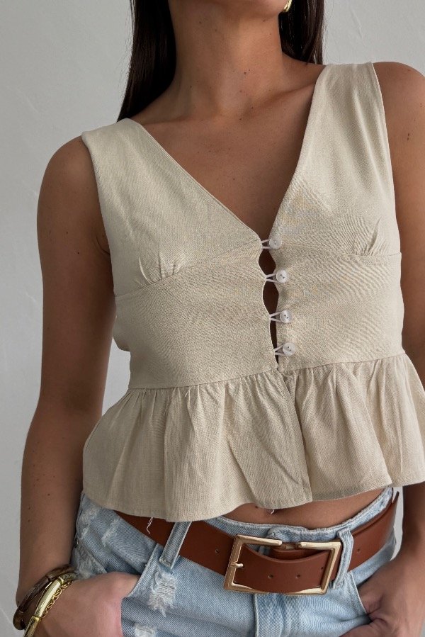 Descripción: top confeccionada en lino premium, con botones al tono en el frente, estilo corset. Disponible en 3 colores: blanco, beige y negro.