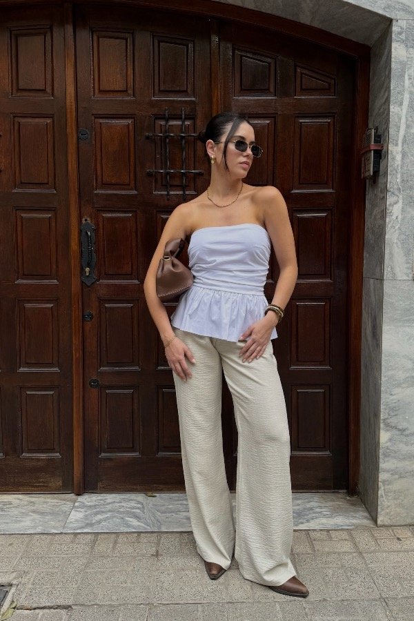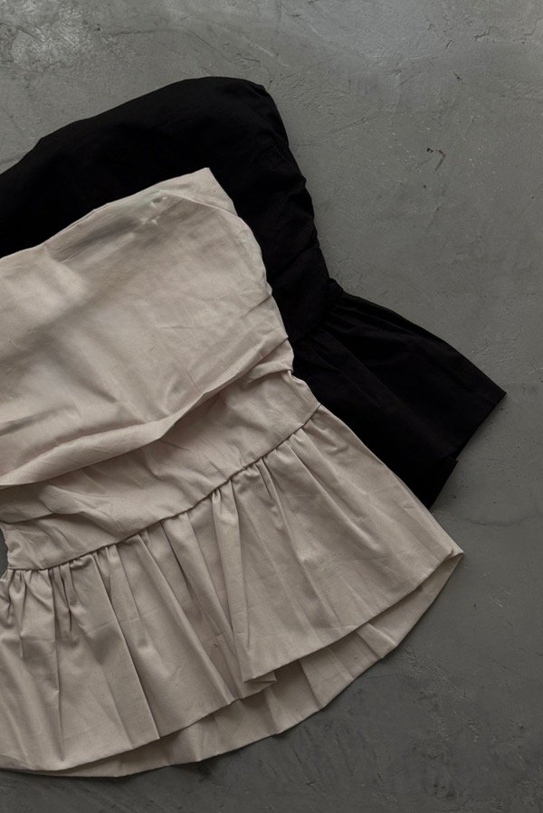 Descripción: top strapples confeccionado en poplin. Detalle de volado. Cierre invisible lateral. Disponible en blanco, beige y negro.